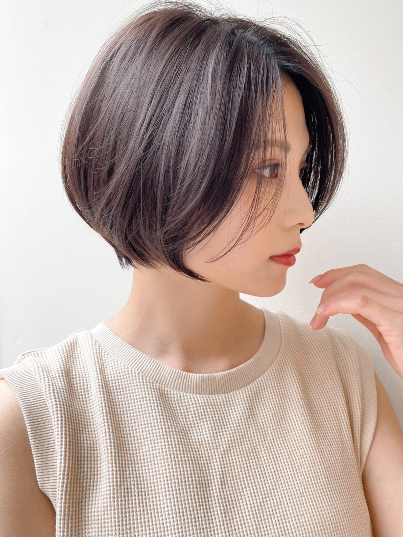 少し長めで、ゆったりとしたシルエットのショートボブ