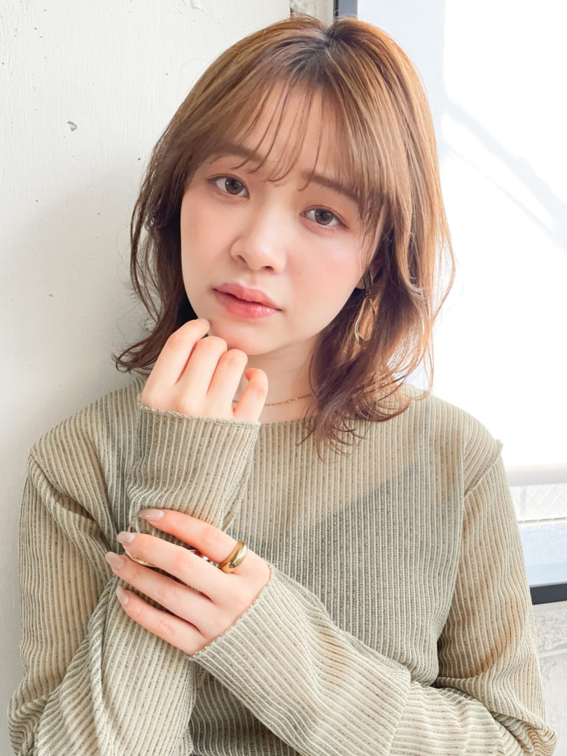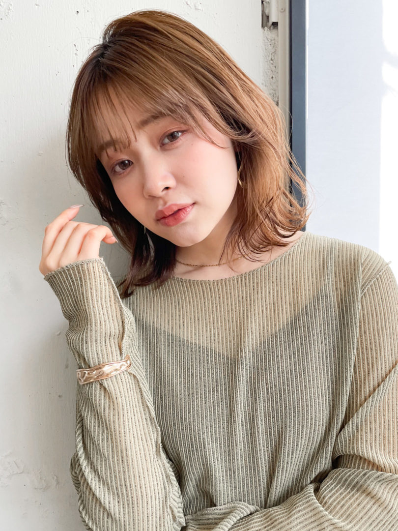 カット・・・ベースは厚みのあるボブスタイルに、表面にレイヤーを入れて、動きが出て柔らかくなるようにカット。お顔まわりのサイドバングがポイントです。