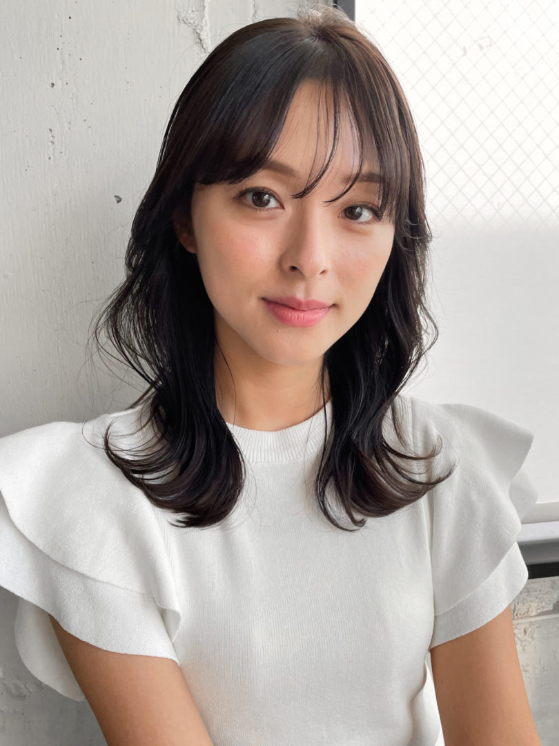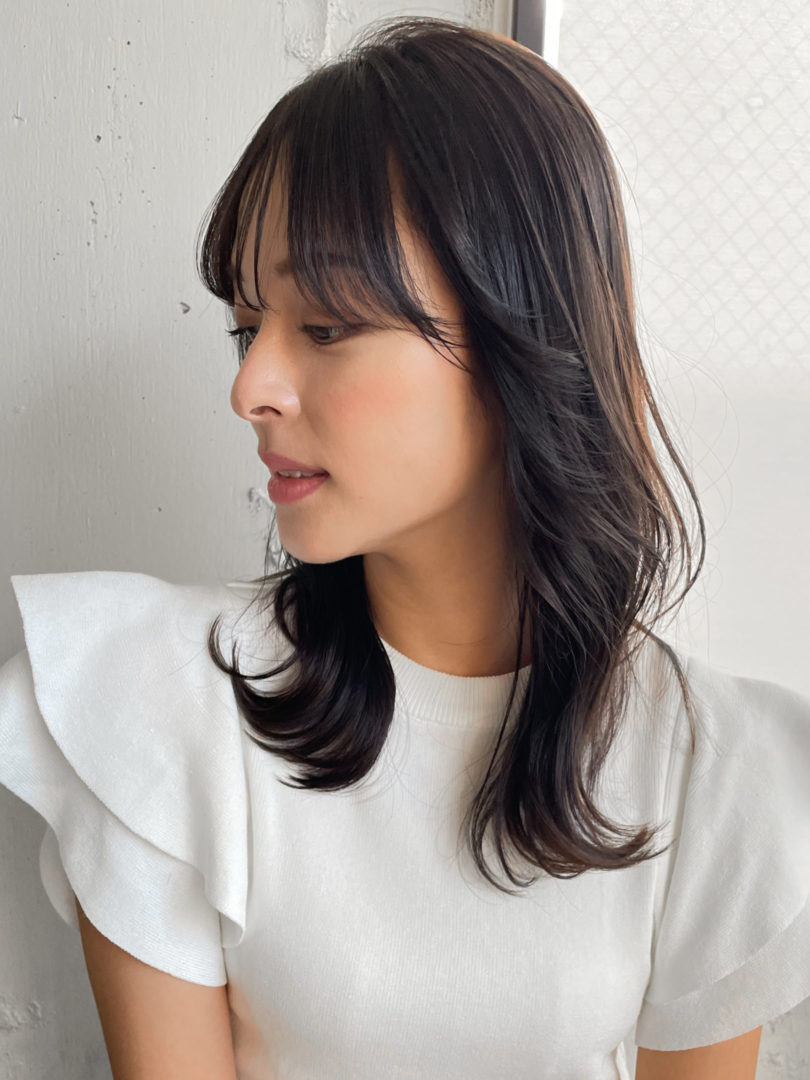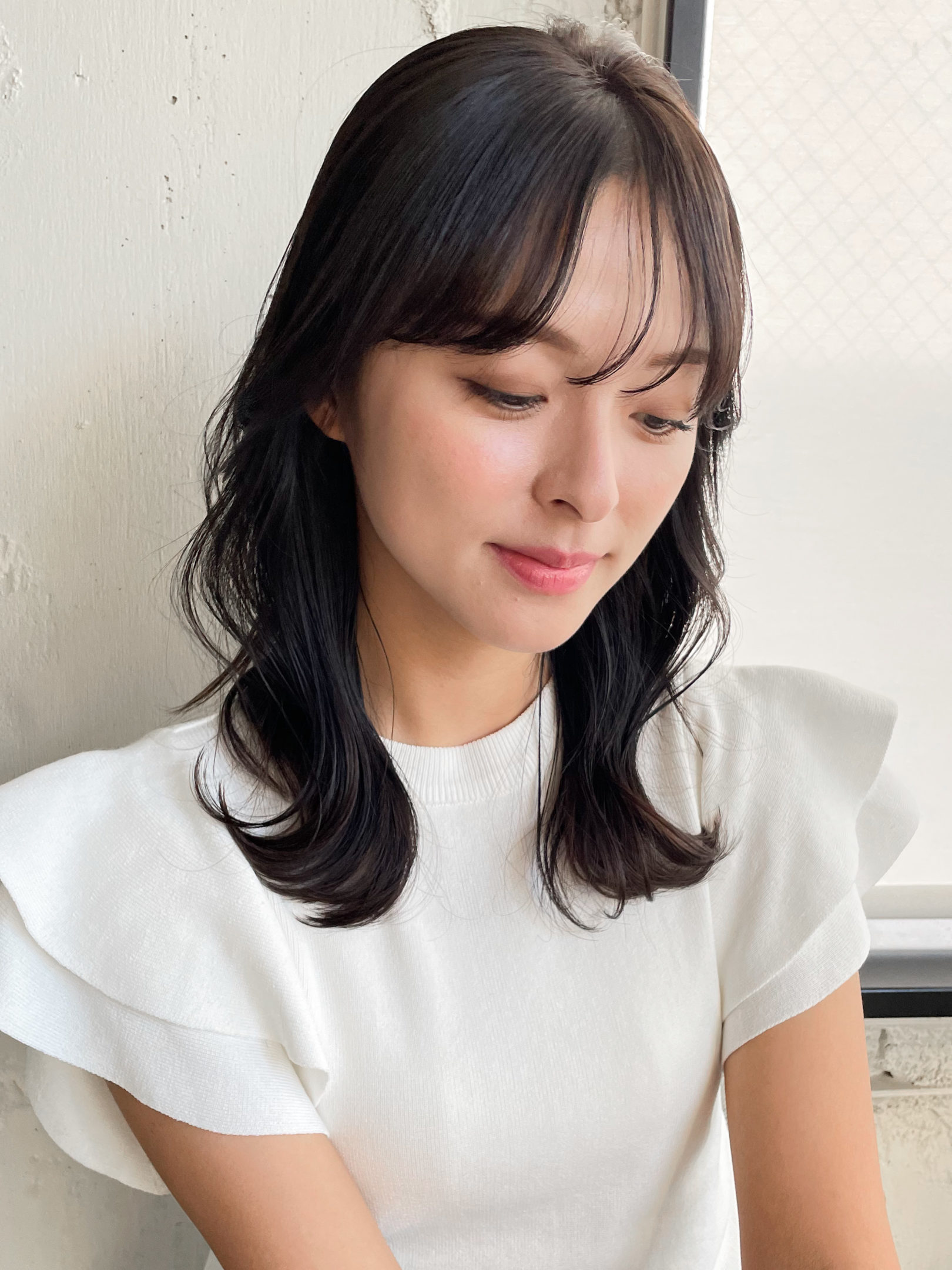 カット・・・ベースは厚みのあるミディアムスタイルに、表面にレイヤーを入れて、動きが出て柔らかくなるようにカット。お顔まわりのサイドバングがポイントです。