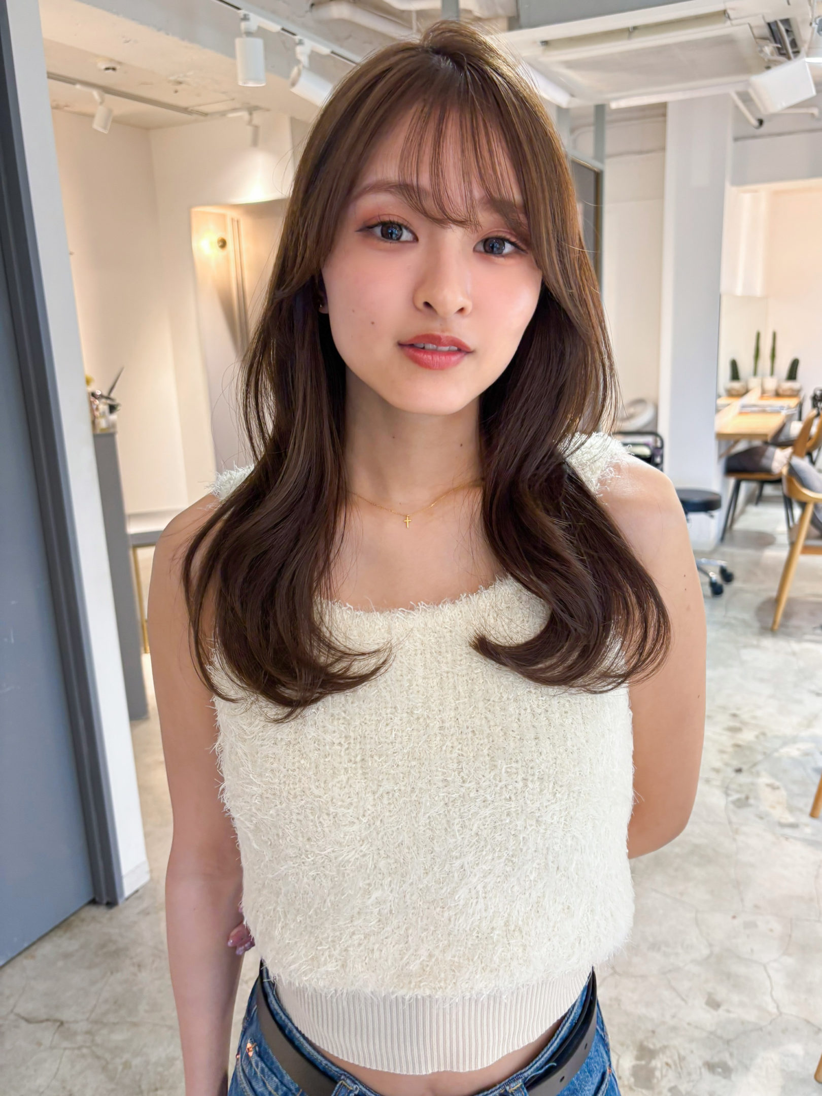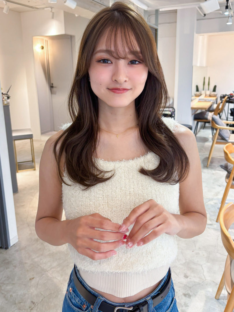 全体を伸ばし中の方や、大人っぽいより可愛い印象にしたい方にはオススメの前髪です。