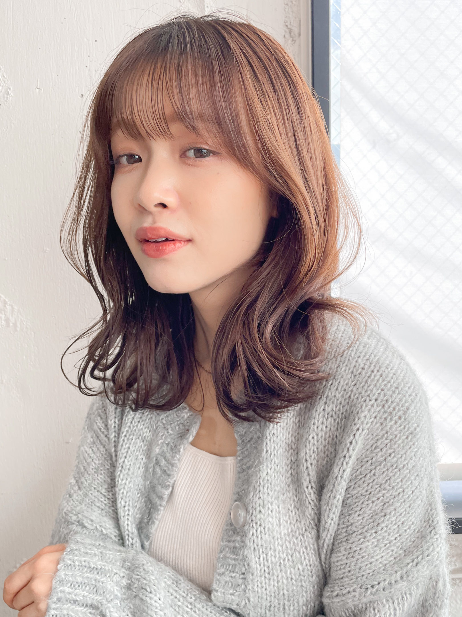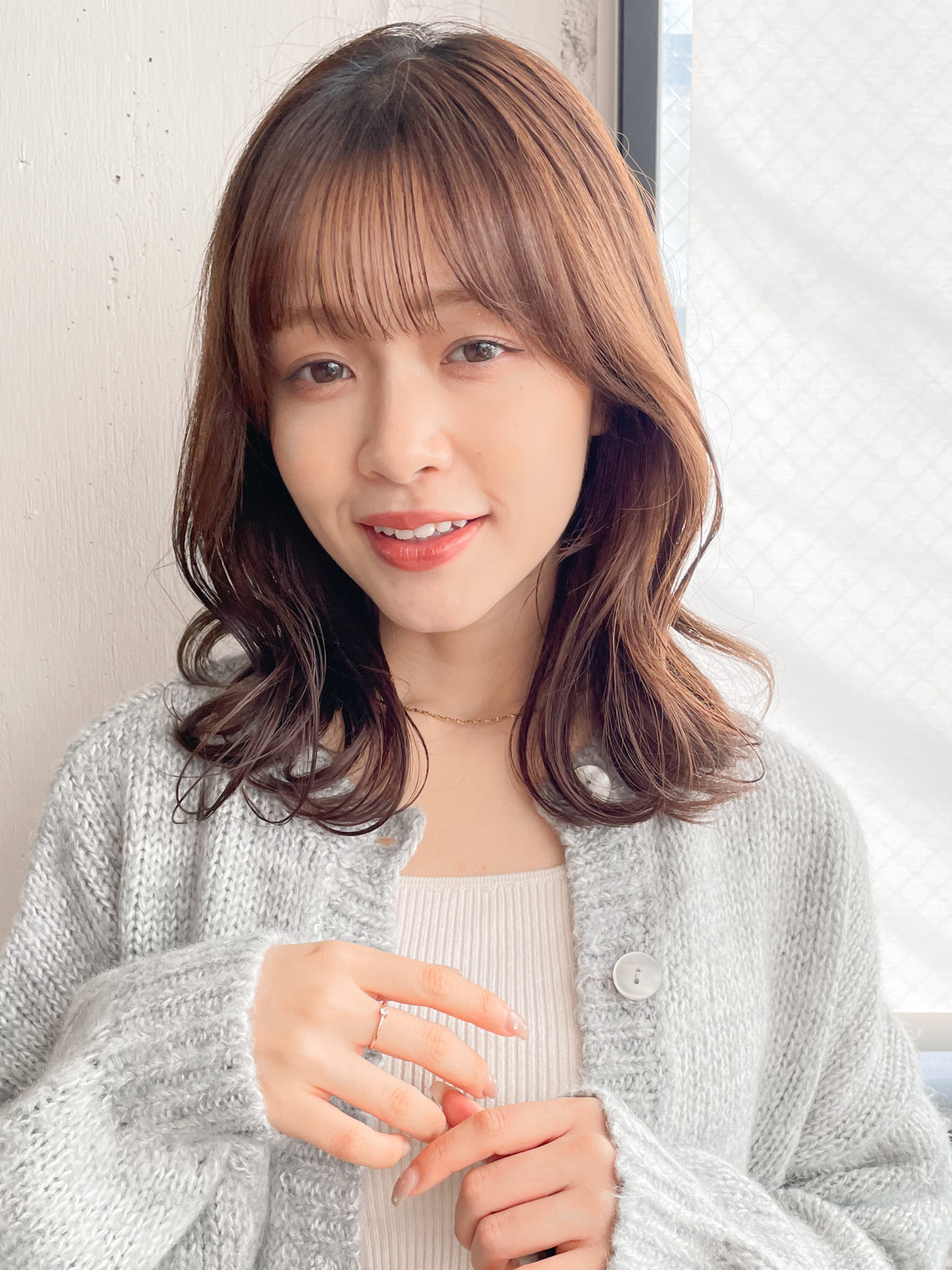 カット・・・ふんわりサイドバングに薄めのぱらっと前髪。トップにレイヤーを入れて、巻いて可愛く。鎖骨下のミディアムヘア。