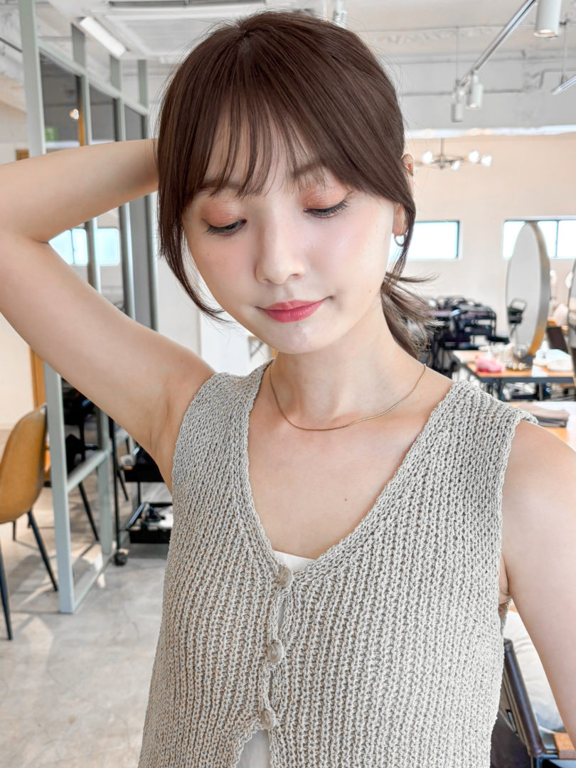 全体を伸ばし中の方や、大人っぽいより可愛い印象にしたい方にはオススメの前髪です。